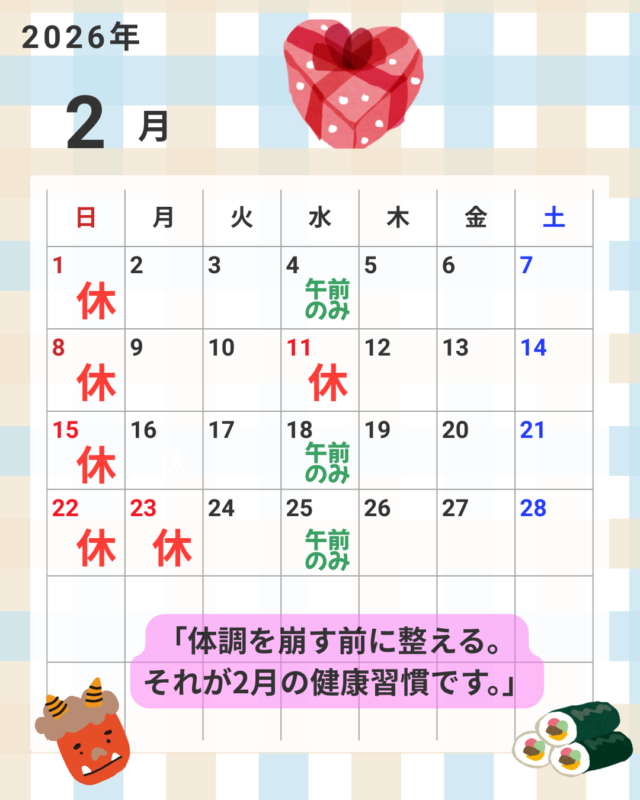 当院では、お一人おひとりの状態に合わせた施術で、2月も全力でサポートさせて頂きます。気になる症状がありましたら、いつでもお気軽にご相談ください。